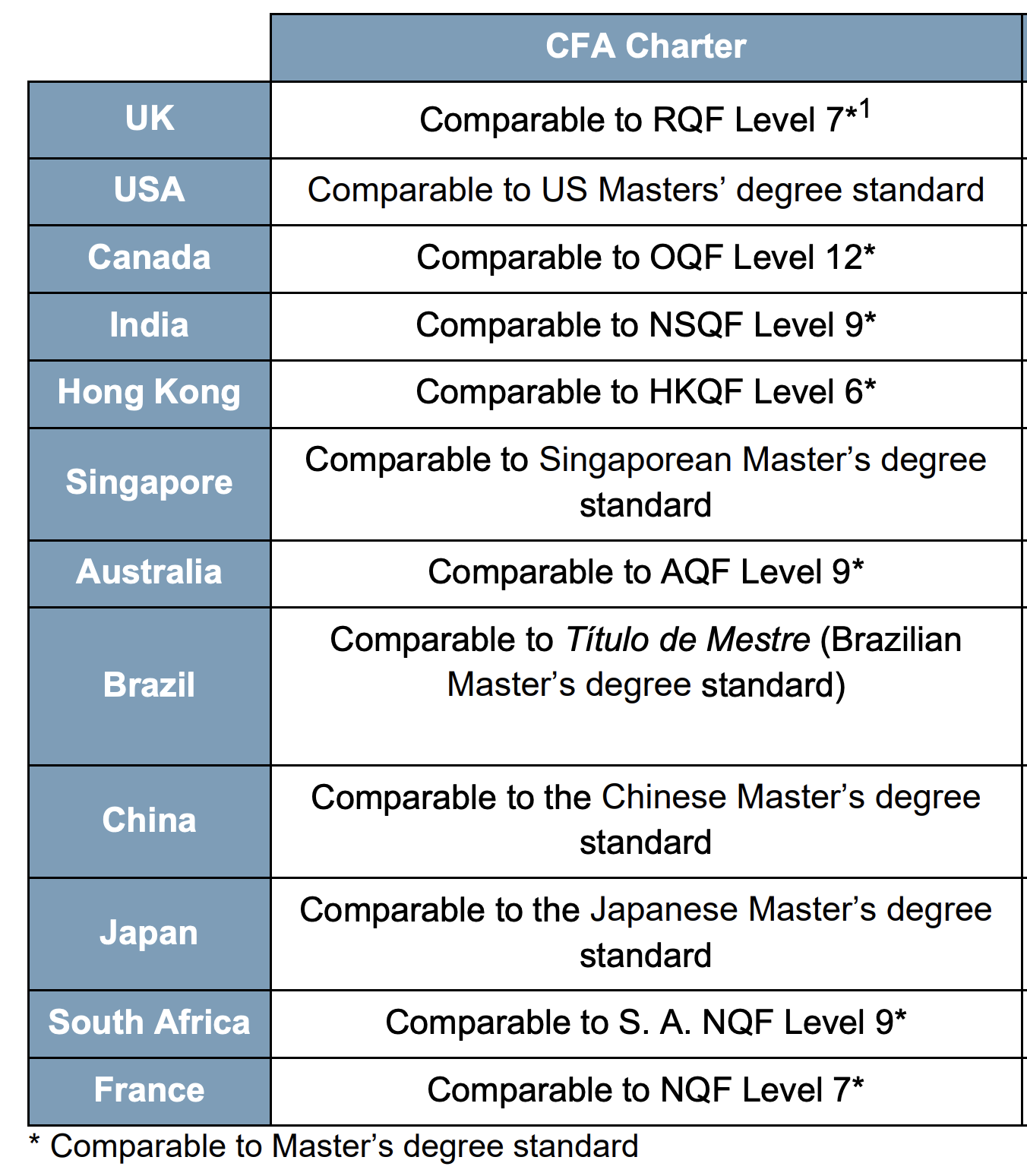 イギリス政府が認定した海外資格評価機関(ECCTIS)の調査によると、CFAは各国で修士(Master’s Degree)に相当すると評価を得ています。働きながら金融領域のMaster’s Degree同等の資格を取れるということで、金融プロフェッショナルだけでなく、他領域からもキャリアチェンジの際に目指すケースが多いです。