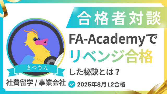 • ただ、もともと試験勉強は得意な方だと思っていたので、1回目の不合格は結構自分の中では、かなりショックで、その時、改めて真剣にもう1回チャレンジするかって考えたんですけど、絶対に受かりたいっていう思いがあったので、 1回目とは違って、しっかり日本語でインプットできる教材に頼ろうって思って、FA-Academyにお世話になることにしました。